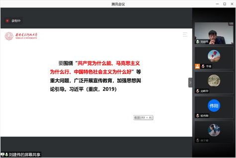 (通讯员 高宇璇)按照学院党委统一部署,5月27日上午,基础教研室党支部组织开展院领导讲党课活动,学习由党支部书记李瑾主持,学院党委副书记刘建伟教授为支部全体党员进行线上授课。