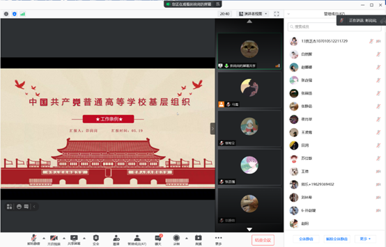 (通讯员 马雪)5月19日晚8点,yl23455永利集团硕士党支部通过腾讯会议方式召开支部学习会议,集体学习《中国共产党普通高等学校基层组织工作条例》,会议有支部书记马雪主持,全体党员、预备党员参加。