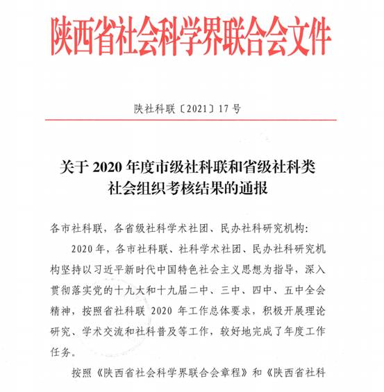 (通讯员 张瑾)2021年3月,陕西省社会科学界联合会对各市社科联、各省级社科学术社团以及各民办社科研究机构2020年度的工作进行了考核,挂靠在我校的陕西省政治学会荣获“2020年度优秀优秀社会组织”称号。