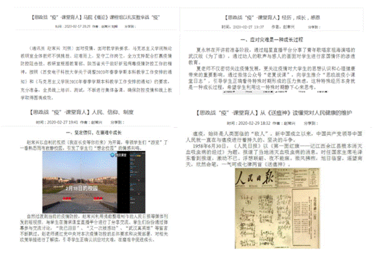 特别是实时将防疫抗疫精神融入课堂教学,提升了教学效果,受到广泛好评。概论课程组在贯彻落实中央防疫抗疫精神方面的努力得到了学院领导的高度肯定,成为本学期思政课教学的一大亮点。课程组老师始终坚持理论联系实际,将最生动的防疫抗疫故事、案例、精神融入到概论课程教学全过程,显著提升了思政课的鲜活性和实效性,增强了学生对中国特色社会主义“四个自信”的认识,产生了思想共鸣、提升了教学效果。教师们总结教学形成的《思政战“疫”·课堂育人》系列报道,也备受好评。
