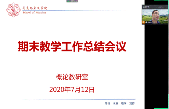 (通讯员 赵常兴)7月12日上午,马院概论教研室召开了期末教学工作总结会议,对本学期线上教学工作进行了全面总结,并对期末考试进行了统一安排部署。会议由概论教研室主任、概论课程负责人赵常兴主持,课程组全体教师参加。