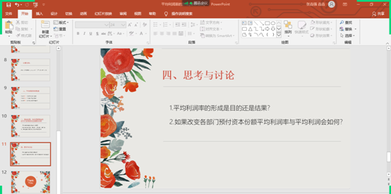 面对这次暴露出来的问题,夏老师进行了一次线上教学模式的创新,就是本文开头提到的老师同学角色互换,由同学们提前准备本次课堂内容,并在课上进行演示。老师提前让同学们就“平均利润如何形成”与“生产价格与价值规律”两个问题进行准备,并在本次课程开始,利用腾讯会议让每一位同学就自己对书本内容的理解进行讲解,通过观察每一位同学的讲解,老师可以及时了解到同学们对本章内容掌握程度。针对同学们讲解时的问题,老师提出了“平均利润率的形成是目的还是结果”与“如果改变各部门预付资本份额平均利润率与平均利润是否会改变”两个问题让同学们进行深入思考。在同学们演示完毕后,老师就同学们对这两个问题的反馈及一些大家普遍疑惑的问题进行解释,并由这两个问题入手,解释清楚了同学们对平均利润率这块内容中的普遍疑惑。最后老师梳理本次课程内容,进行总结,使大家加深印象。这次的线上授课明显可以感觉到大家的积极性被老师调动了起来,同学们在演示过程中将自己不懂的内容大胆提出,也就老师提出的问题进行自己的思考解答。经过自己提前思考,大家再听老师讲解,可以更好更快地理解,明显可以感觉到同学们对于老师本节课讲授的内容接收很快。本次的课程进度相比于前几次课也是大大提升,看似每位同学演示会花费大量课堂时间,但相较于之前老师不了解同学们对课堂内容的掌握程度只能全部讲授而言,讲课效率是大大提升,这就是“磨刀不误砍柴工”。