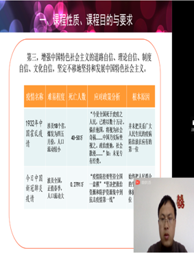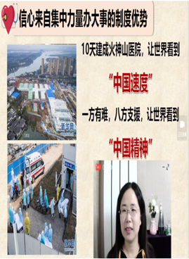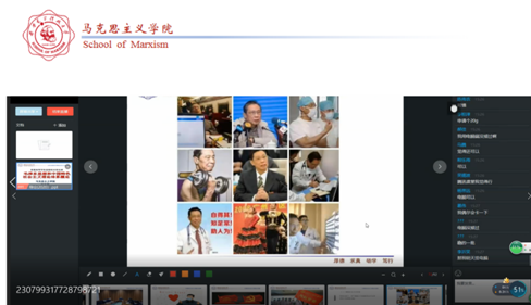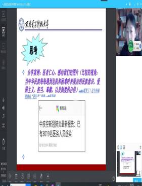 《概论》教研室支部书记程霞、青年教师孙金菊在开学第一课中,围绕教学目标和要求,将战“疫”故事有机嵌入教师主导讲授环节中,通过文章、图片、微视频等多种方式展示疫情防控中的中国精神和中国智慧,让学生在不断增强“四个自信”中激发爱国热情。青年教师徐雪强在“中国近现代史纲要”课程中,运用辩证唯物主义的原理分析了新中国成立之前国民党疫情防控的决策及后果和新时代在中国共产党领导下疫情防控的壮举及效果,让学生在今昔对比中感受社会主义制度优越性和中国力量。韦统义、赵武、孙江可等老师将抗“疫”诗词、名句引入教学,启迪学生思考。