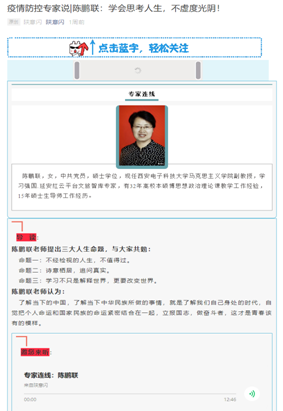 学院党委书记、教育部“高校网络教育名师培育支持计划”入选者夏永林,利用微信公众号“老夏说课”精心培植战“疫”的“精神疫苗”,率先举起了思政战“疫”的旗帜。他将学理与实践相结合,根植党和国家的要求、人民的期盼和实际需要,先后书写思政战“疫”原创文章20余篇,唱响了“家国情怀”“使命担当”“服务人民”的时代主旋律,累计点击量超3万。多篇文章被人民网、今日头条、全国高校思想政治工作网、壹学者思政研究公众号、陕西高校网络思想政治工作中心等平台转载和《教师报》等媒体刊登。他的事迹被教育部网站、人民网、澎湃新闻、当代先锋网等报道。
