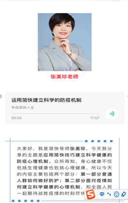 学校“师德标兵”陈鹏联,参加了陕西广播电视台《抗疫援鄂和你在一起》大型专题特别节目的录制活动。她凭借丰富的教育教学经验,抽丝剥茧地剖析了疫情期间各种错误“论调”,谆谆教导青年人:“心存感激和敬畏之心”,“立报国志,做奋斗者,这才是青春该有的模样”。殷切之情感动了很多人。从事心理咨询工作多年的张美珍,参加陕西高校战“疫”心理援助志愿服务队,录制抗“疫”公益微视频,并为援建武汉“两山”的工人、战“疫”一线的医生和居民做心理疏导。她卓有成效的工作得到了各方认可,一位参与她公益讲座的听众说:“自己得到了开解和提高,让憋在家里的焦躁、焦虑情绪得到了很大缓解。”