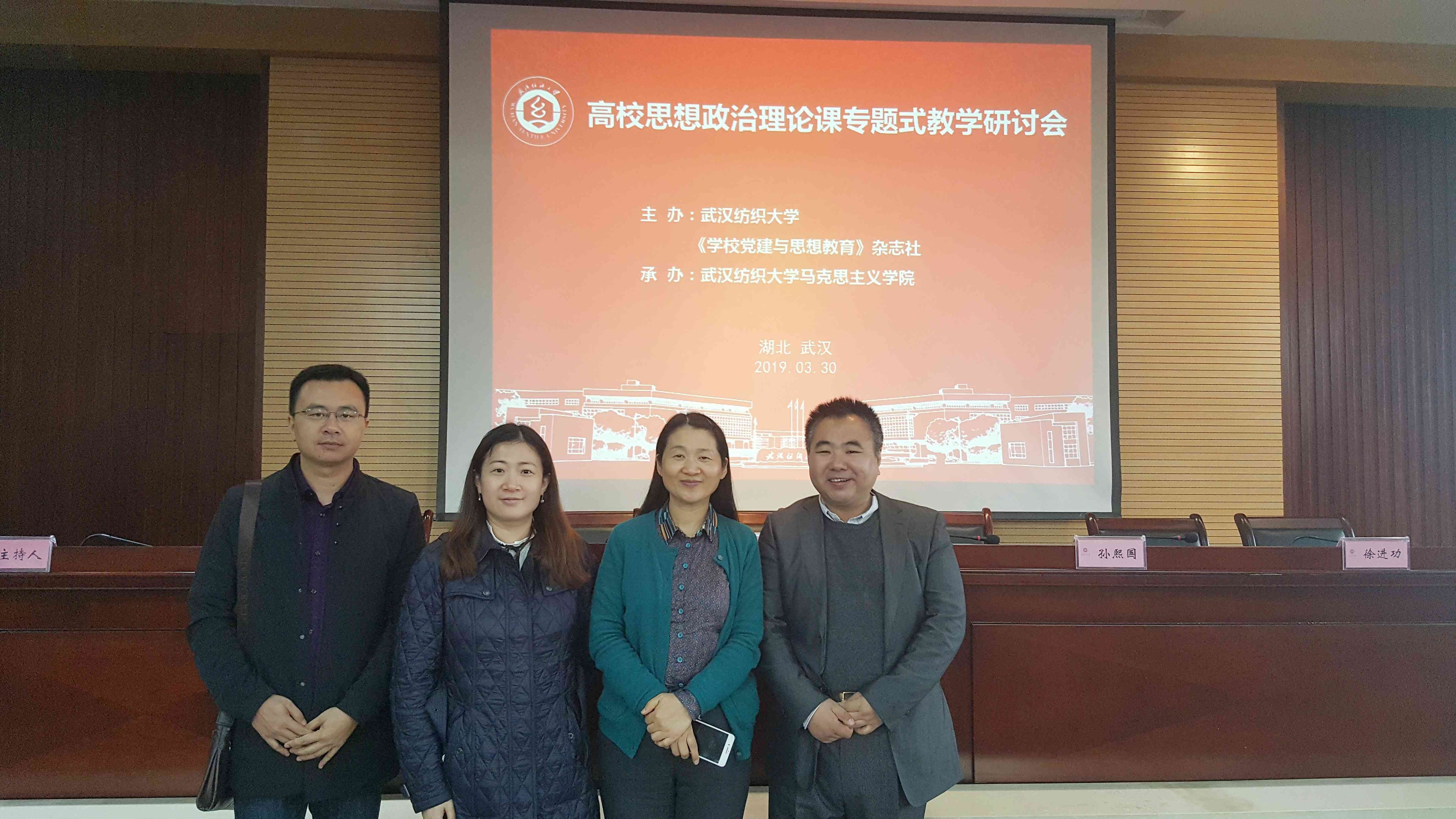 (通讯员 刘飏)3月30日,为积极学习和贯彻习近平总书记在学校思想政治理论课教师座谈会上的重要讲话精神,武汉纺织大学召开“高校思想政治理论课专题式教学研讨会”,yl23455永利集团原理教研室骨干教师蒋冬双、李垣、刘飏一行三人赴会学习。