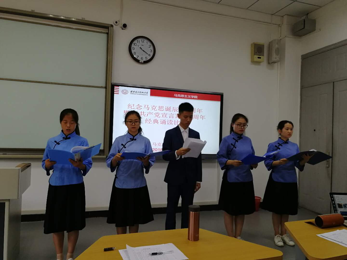 (通讯员 张鹏伟 田朝晖)5月19日上午,在C楼232和233教室,不时响起一阵阵铿锵有力的朗朗书声,“全世界无产者联合起来”,“人固有一死,或重于泰山,或轻于鸿毛”,“坚持不忘初心,继续前进”……原来,这是我校纪念马克思诞辰200周年暨《共产党宣言》发表170周年所开展的题为“拥抱新时代”——西电大学生经典诵读活动比赛的初赛现场。