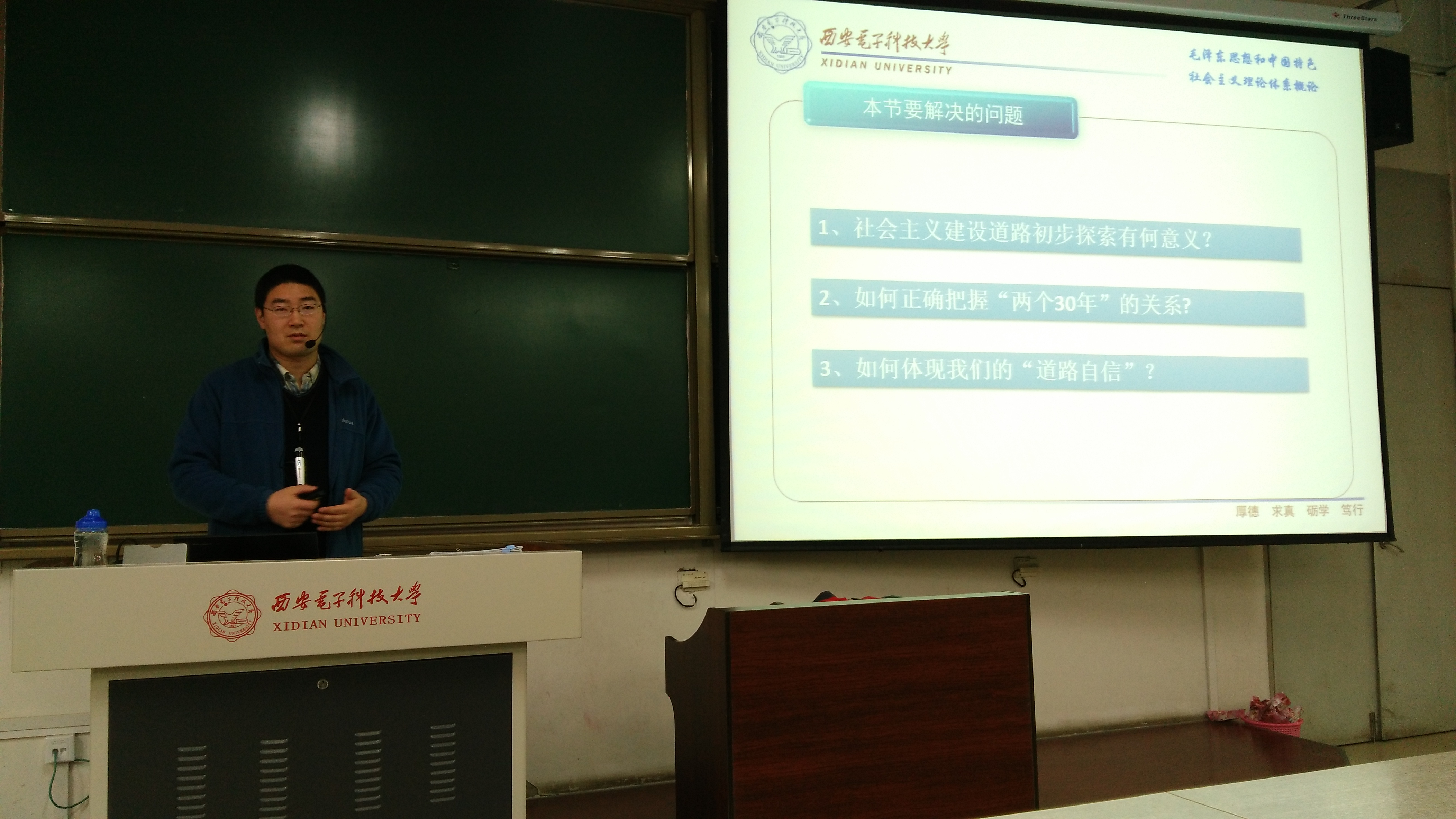 十分钟时事分享之后,赵常兴老师围绕“中国特色社会主义道路”展开讲解。首先,总结了社会主义建设道路初步探索的经验教训。其次,在总结正反两方面经验教训的基础上,重点剖析了“正确认识改革开放前后两年三十年的关系”,提出不能将“两个三十年”割裂开来,更不能对立起来,两者同属于社会主义实践探索的不同阶段,是一脉相承的历史整体。最后,针对“道路自信”问题,赵常兴老师引用了大量的统计数据,通过与中国过去60多年发展相比较、通过与当前西方发达国家相比较、通过对中美解决现实问题的能力相比较,引导学生真正理解中国特色社会主义道路是中国实现中华民族伟大复兴的必然之路,从而进一步增强“道路自信”。