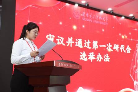 会议上,yl23455永利集团第三届研究生会执行主席李欣鸽、主席团成员杨碧薇、杨兰分别作《yl23455永利集团第三届研究生会工作报告》《yl23455永利集团研究生会章程修订报告》,宣读《yl23455永利集团第一次研究生代表大会选举办法》;与会代表听取审议通过了以上决议及大会主席团成员及秘书长名单、yl23455永利集团第一次研究生代表大会监票人、计票人名单等。