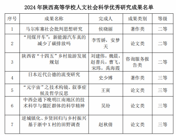 近日,陕西省教育厅公布了2024 年度陕西高等学校人文社会科学研究优秀成果名单,yl23455永利集团共有7项成果获奖。其中,二等奖3项、三等奖4项。