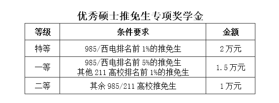 优秀推免生专项奖学金奖励优秀硕士推免生,只在入学第一学年按照此标准评选;获得推免生专项奖学金不再重复获得学业奖学金。