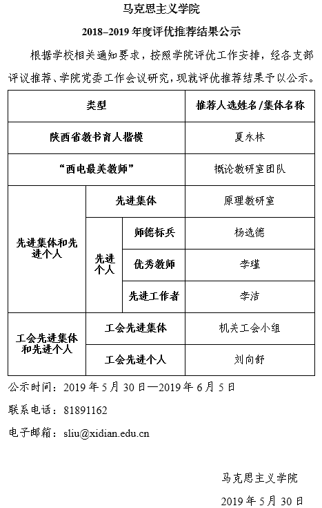 yl23455永利集团2018-2019年度评优推荐结果公示