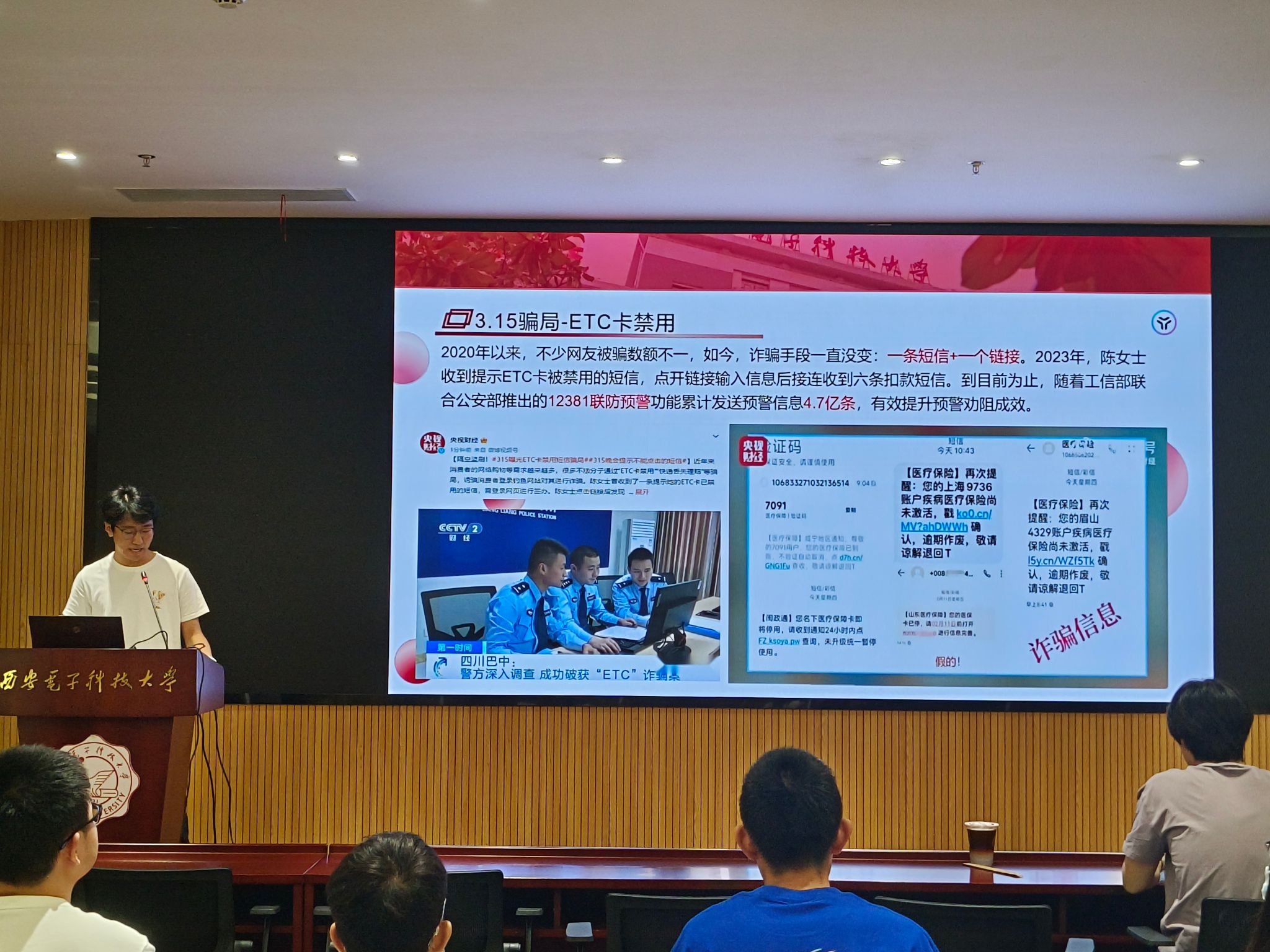 网络与信息安全学院王默轩同学以2020年以来网民遭受诈骗的各类实例、数据盗窃攻击和数据泄露事件为例,证明了网络空间安全的重要性所在,即“没有网络安全就没有国家安全”。紧接着,王默轩同学以简洁生动的形式讲述了总体国家安全观的核心要义,从国家、企业、人民角度展示了我国在保护网络空间安全中所做出的卓越成就,并用丰富的图文分享了网络与信息安全学院在全民国家安全教育中的实践身影。最后,王默轩同学倡导大家都能参与到网络安全学习和传播中来,共同打造清朗安全的网络空间环境。