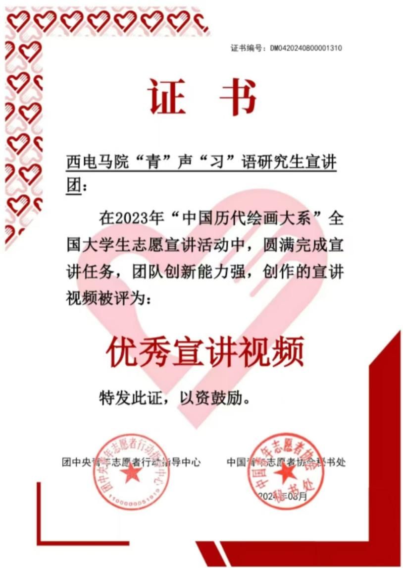 此次在“中国历代绘画大系”全国大学生志愿宣讲活动中的优异表现,是宣讲团长期以来坚持理论学习、深化实践的结果,展现了团队成员在理论宣讲方面的专业素养和创新精神。未来,西电马院“青”声“习”语研究生宣讲团将不断提高宣讲水平,继续推动中华优秀传统文化创造性转化、创新性发展,为中华文化的繁荣与发展贡献青春力量。