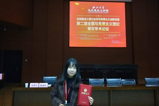 (通讯员 刘朔)近日,“全面建成小康社会与马克思主义创新发展研究”暨第二届全国马克思主义理论青年学术论坛优秀论文评选结果揭晓,学院研二学生赵阳撰写的《十八大以来中国共产党推进农村教育扶贫的内在逻辑》荣获一等奖。11月7日,赵阳应邀参加了在西北大学长安校区举行的论坛。
