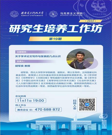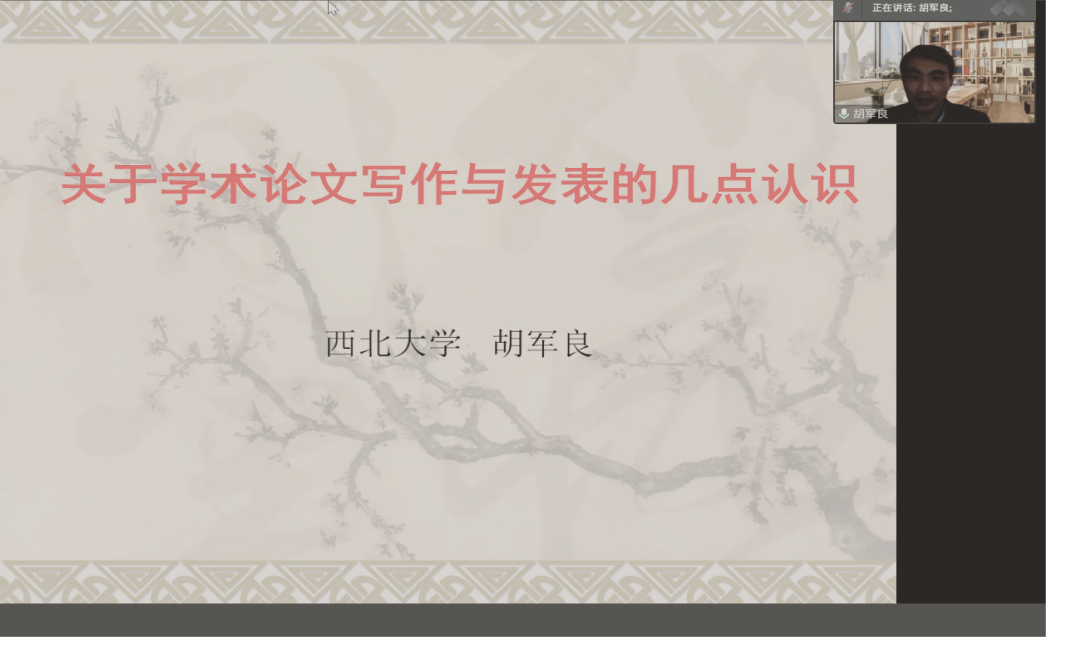 (通讯员 白丹 冷春春)1111日,yl23455永利集团顺利举办第19期“研究生培养工作坊”学术沙龙活动。本次沙龙邀请到西北大学哲学学院副院长、博士生导师胡军良教授为大家作题为“关于学术论文写作与发表的几点认识”的主题报告。活动通过线上开展,由22级研究生白丹主持。