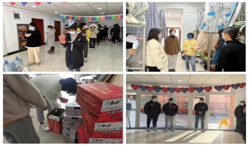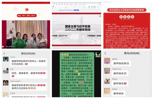 学院加强正面引导、心理疏导和人文关怀,切实保障基本生活学习。党委书记夏永林为学生录制视频,提出倡议和要求;院长李刚和党委书记夏永林代表学院领导班子为学生送上新年祝福和电子贺卡。封闭管理后,分管副院长和辅导员千方百计为学生添购防疫物资,安全稳妥送达学生手中,通过工作群、电话、微信等与学生做好谈心谈话,为学生妥善联系解决校外就医等问题。按照研工部要求,辅导员及时入住宿舍楼,建立楼长——楼层长——宿舍负责人联动机制,在楼内协管疫情防控、服务学生。学院领导、辅导员、学生干部及时准确了解学生情况和思想动态,切实开展网上心理健康教育,帮助学生调整心理状态,缓解可能出现的心理压力和焦虑情绪。思政课教师张美珍老师线上为同学们开展心理健康讲座。元旦期间,学院领导为学生联系、购置牛奶、方便面等生活保障物资,送去学院的祝福和温暖。研究生导师和研究生保持密切联系,在元旦前夕纷纷与学生开展活动,营造了师生同心抗击疫情的氛围。学生党支部政治理论学习不断线,学生党员、入党积极分子在线集中学习习近平总书记元旦贺词,开展战疫征文活动。学院研究生会举办跨年“宿舍嘉年华”等联欢活动,组织学生录制视频祝福新年。学生疫情防控工作井然有序,“疫”尘不染。
