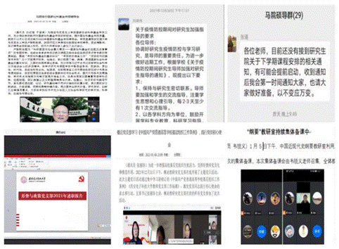 学院充分发挥思政课教师的专业优势,全院教师全力以赴做到抗击疫情不放松,思政教研不停摆,充分发挥思政课在疫情防控期间对学生思想教育的主渠道作用,立足本职岗位为防疫工作做贡献。学院动员研究生导师在线上与学生进行联系、指导,加强日常联系,切实履行第一责任人职责。同时,导师在线上积极进行心理支持,针对性地安抚疏解学生紧张焦虑情绪,布置学习任务,指导科学研究、论文写作和线上调研,分享居家查阅资料、读书和写作的妙招,全方位保障学生身心健康,助力学生学习、研究。