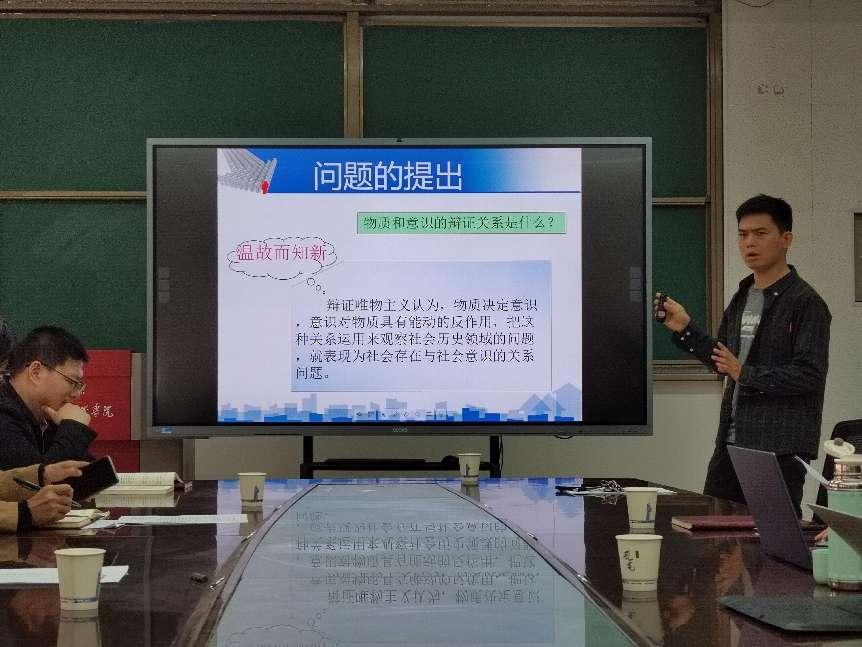 高帅老师以《社会存在和社会意识的辩证关系》为题进行教学展示,从社会存在决定社会意识以及社会意识具有相对独立性两个问题出发展开讲解,结合大量案例实例,把握语言节奏,以平稳的“讲台台风”和深入浅出、娓娓道来的方式对这一专题进行了精彩的阐释,得到一致好评。
