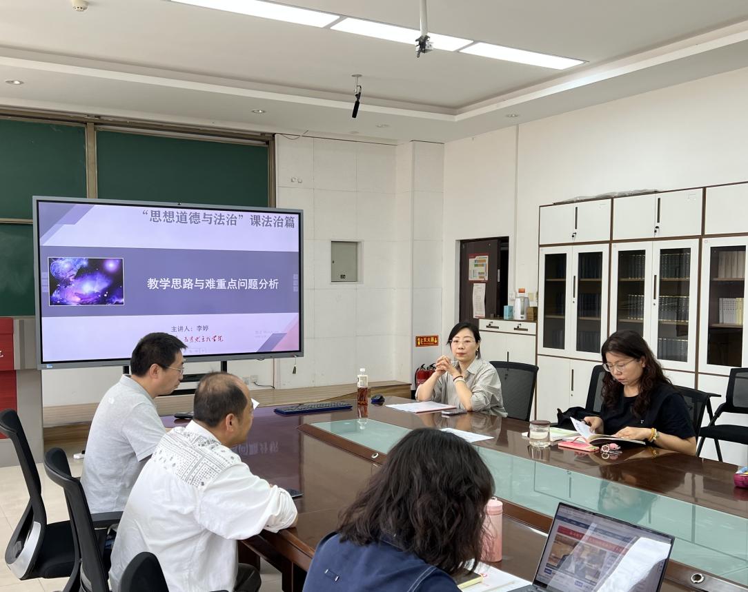活动最后,张阔海老师总结到,李婷教授的说课思路清晰、逻辑严密;示范课生动形象、深入浅出,准确把握了德法课第六章法治部分的学科属性、政治属性和时代特性,也体现了思政课思想性、理论性和亲和力、针对性的统一,为提升思政课教师教学能力和授课水平树立了良好的课堂榜样。