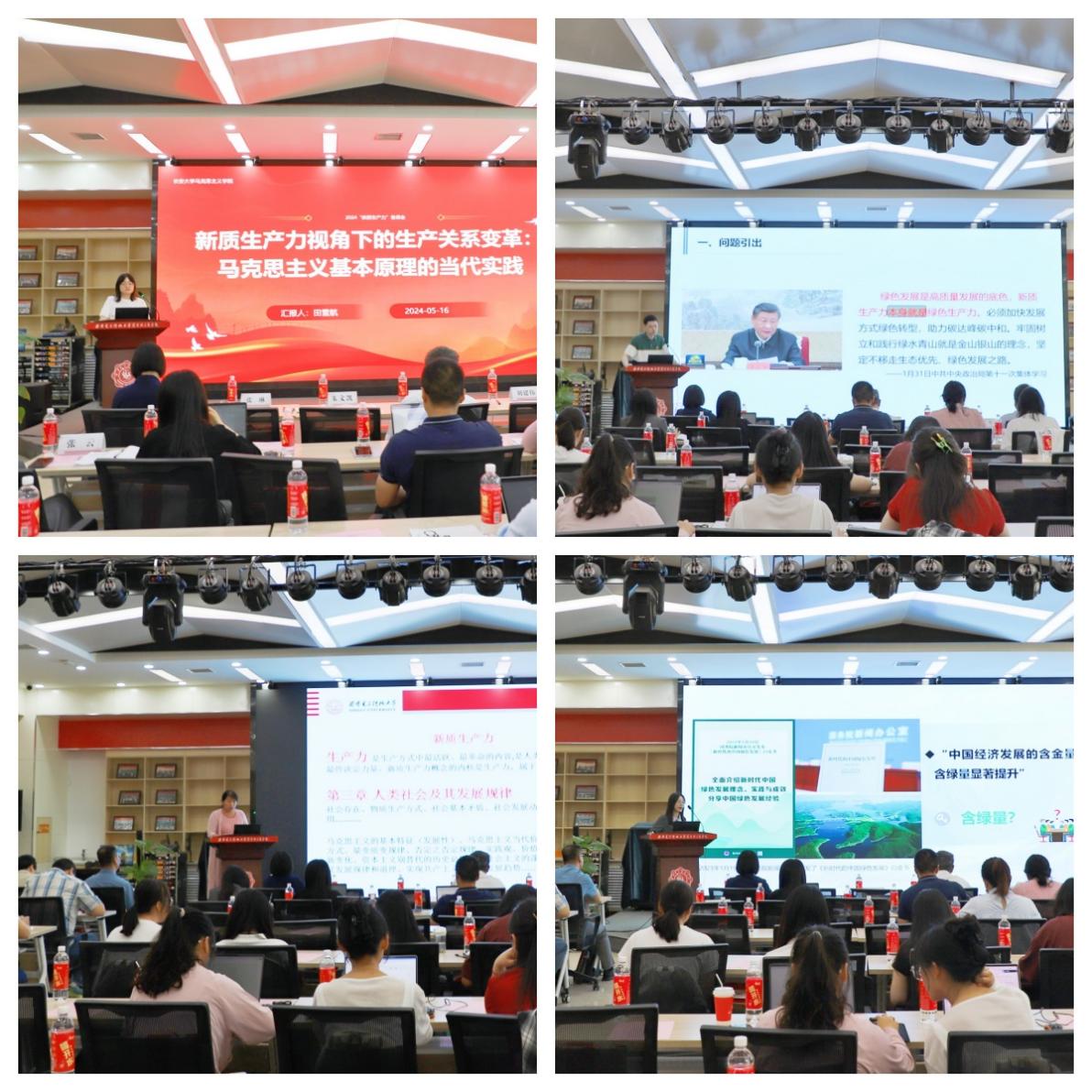 会议第三部分进行“新质生产力”教学展示,由赵常兴副院长主持。长安大学田雪航老师进行题为“新质生产力视角下的生产关系变革”的教学展示,以阿里巴巴的新零售战略为案例引入,从马克思主义生产力与生产关系的理论基础到新质生产力如何影响生产关系的实际分析,总结得出加快形成与新质生产力相适应的新型生产关系的方法论。陕西师范大学杨永浦老师以“新质生产力本身就是绿色生产力”为题进行教学展示,从习近平总书记提出新质生产力就是绿色生产力的论断出发,分别从生产力和生产关系维度进行理论解读,认为新质生产力的绿色属性具有理论应然性,而新质生产力的实现路径就是“1+5”路径体系,即形塑以“两山”理念为核心的生态价值体系。yl23455永利集团刘向舒老师以“‘新质生产力’融入马原课程的思考——以唯物史为例”为题进行教学展示,从“两个了解”、“一个明确”、“三个属性”、“五个视角”、“四个途径”展开对于新质生产力的理论阐释,尤其以唯物史观的角度看待新质生产力的形成条件、发展与提升,体现了其较高的理论水平和素养。陕西交通职业技术学院张云老师以“中国经济向‘绿’而升”为题进行教学展示,从中国经济成绩单含绿量显著提升到中国经济回升为什么需要含绿量,以及如何继续提升中国经济的含绿量的逻辑发展进路,阐明发展新质生产力即绿色生产力的重要意义。
