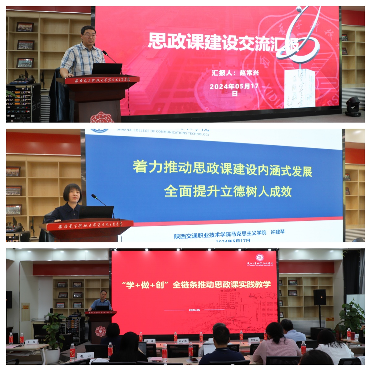 会议第五部分为经验交流环节,由刘建伟副院长主持。赵常兴副院长首先就红色西电思政课堂开展,坚持以学生为主体、鼓励课堂参与,注重教师培训、提升素养能力,探索五位一体、强化名师引领,创新三大思政课、彰显西电特色等方面进行思政课建设交流汇报。王辉院长以“‘学+做+创’全链条推动思政课实践教学”为题进行汇报交流,以“移动式”课堂扩展形式、“沉浸式”课堂创新渠道、“输出式”课堂凝练成果为实施路径,从教学理念、目的、方法以及教学环节上全面推动思政课改革与建设。许建琴院长以“着力推动思政课建设内涵式发展,全面提升立德树人成效”为题进行汇报交流,从党委重视、制度保障,建好关键课程双融双促、三段递进、建强师资队伍,构建“大思政课”格局、培育时代新人展开三个方面展开,促进党建和思政课建设的深度融合。