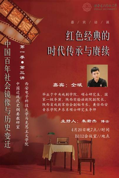 (通讯员 朱君杰)4月20日,yl23455永利集团中国近现代史纲要教研室《银幕流年:中国百年社会镜像与历史变迁》第三期——“红色经典的传承与赓续”主题访谈活动在南校区B楼112室举行。国家一级导演、陕西省实验话剧院副院长、话剧《永不消逝的电波》和《毕德显》编剧、学校话剧团的指导教师仝斌作为特邀嘉宾出席活动。yl23455永利集团副院长王晋、纲要教研室呼啸老师和40余名学生参加了活动,活动由纲要教研室朱君杰老师主持。
